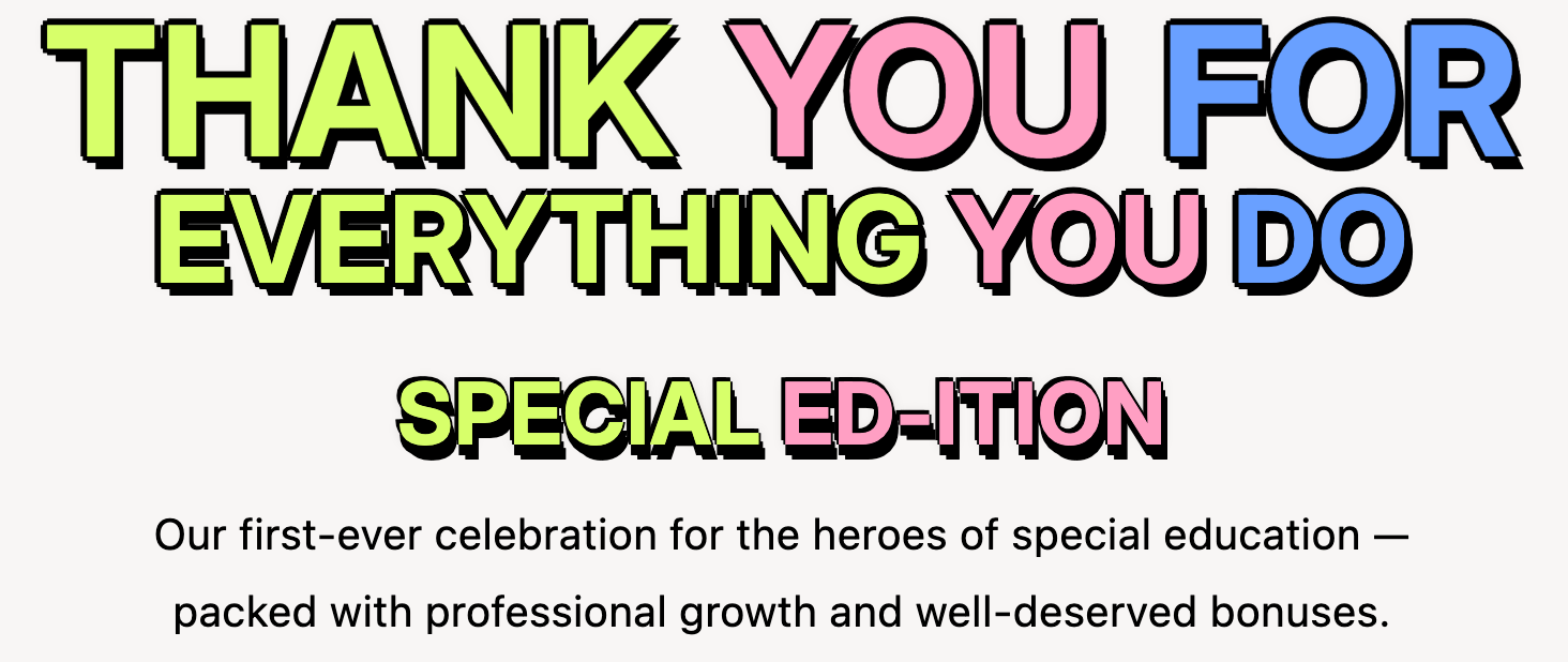 Today only, anyone who purchases the Thank You Bundle will also receive Stephanie DeLussey’s brand-new Special Education Bootcamp (Modules 1 & 2) - a powerful, practical training series from one of the field’s most trusted educators - for free.