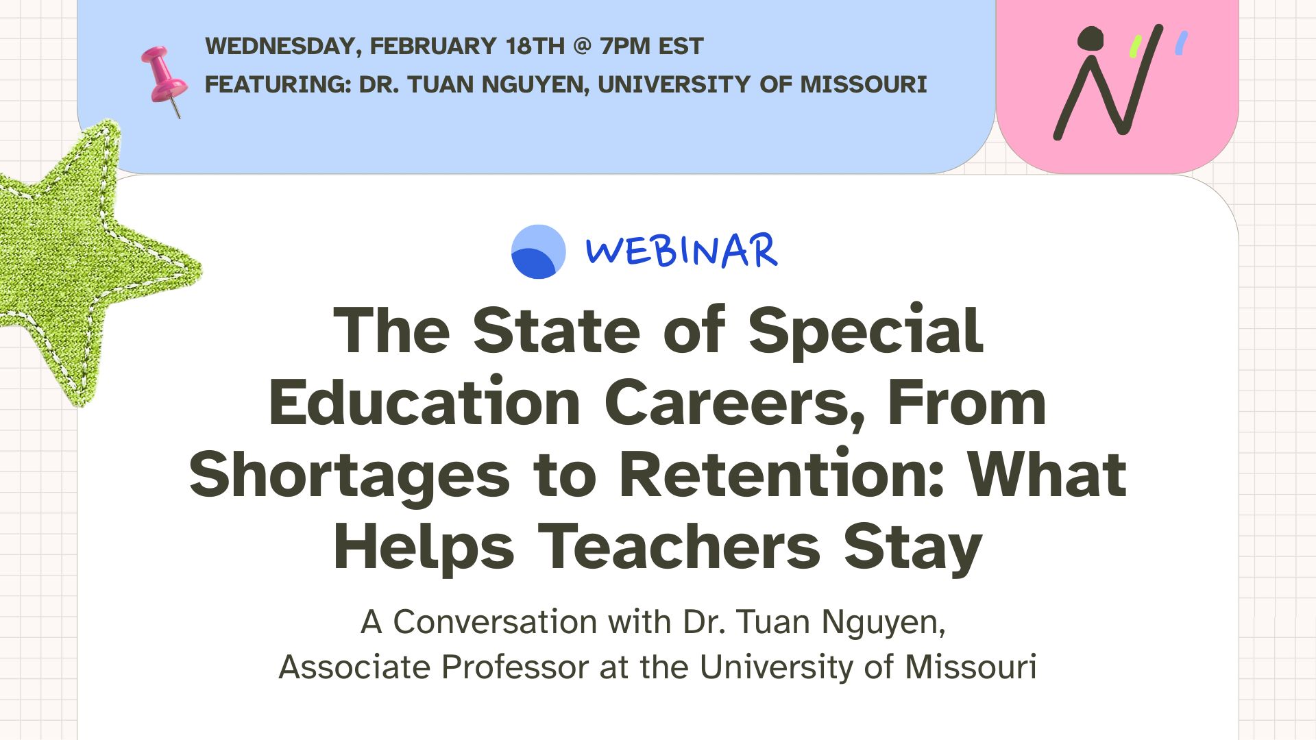 The conversation around special education teacher shortages often misses what is actually happening. On February 18th at 7PM EST, Dr. Tuan Nguyen, creator of TeacherShortages.com, will break down the data behind why districts struggle to retain teachers even after positions are filled. He will also explain which commonly used retention strategies fail, and what the evidence shows actually keeps educators in the classroom.